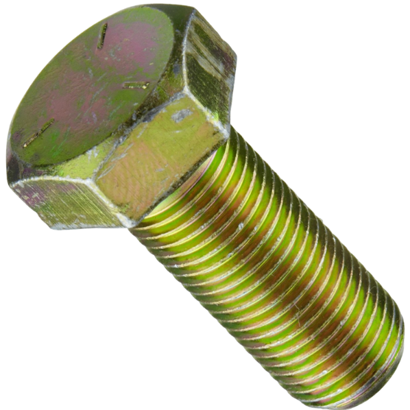 Grade 5 hex head tap bolts with yellow zinc plating are medium-carbon steel fasteners offering enhanced corrosion resistance and a bright finish. The hex head allows easy installation and removal, making them ideal for machinery, structural assemblies, and light construction projects requiring medium-strength bolts with surface protection.
