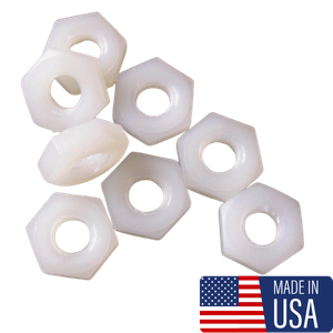 Proudly Made in the USA, our nylon hex nuts deliver dependable performance across a wide range of commercial, industrial, and maintenance uses. They are commonly used in sensitive equipment, light‑duty assemblies, corrosive environments, and non‑metallic hardware setups where weight reduction, protection, or insulation is essential. Available in multiple sizes and compatible with standard machine screws and bolts, these plain nylon nuts provide clean, consistent quality backed by American‑made manufacturing.